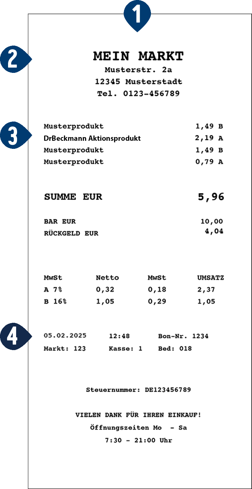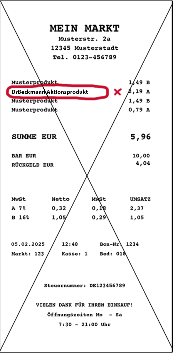 Markieren Sie bitte nichts auf dem Kaufbeleg. Setzen Sie kein Kreuz an die Produkte und rahmen Sie diese auch nicht ein.