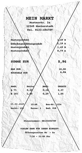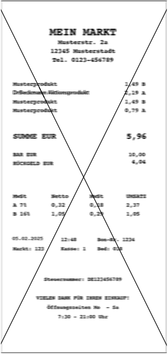 Der Kaufbeleg muss immer glatt von oben fotografiert werden. Perspektivisch verzerrte Aufnahmen, gefaltete oder zerknitterte Kaufbelege werden nicht akzeptiert.